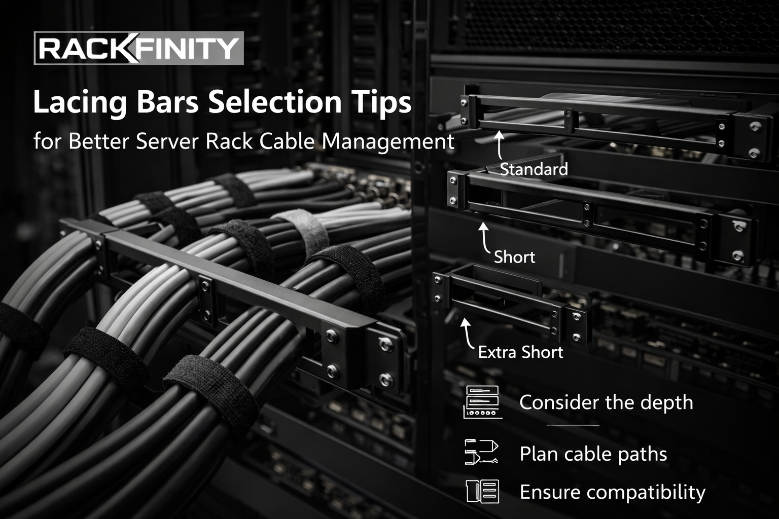 Lacing bars help guide and support cable bundles behind switches, patch panels, and other rack equipment. However, selecting the correct bar is just as important as installing it properly. The right choice ensures better cable routing, easier maintenance, and long-term rack stability. Rackfinity recommends following a few practical selection tips to ensure the best results for server rack cable management.